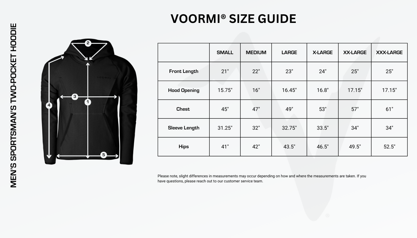 Recognized as a top innovation by Popular Science, the Sportsman's Two-Pocket Hoodie is more than just your average sweatshirt. VOORMI's CORE CONSTRUCTION® technology keeps you warm and dry in harsh weather while remaining breathable and quiet. The relaxed fit allows for easy layering, and the unique kangaroo pocket system ensures you can access essentials even when wearing waders. This versatile hoodie transitions seamlessly from midlayer to outer shell, and pairs perfectly with the V1 Jacket and Bibs for a complete weatherproof system. Ditch the bulky layers and experience unmatched comfort and performance – the Sportsman's Two-Pocket Hoodie is your all-condition companion, built to last a lifetime of adventure.